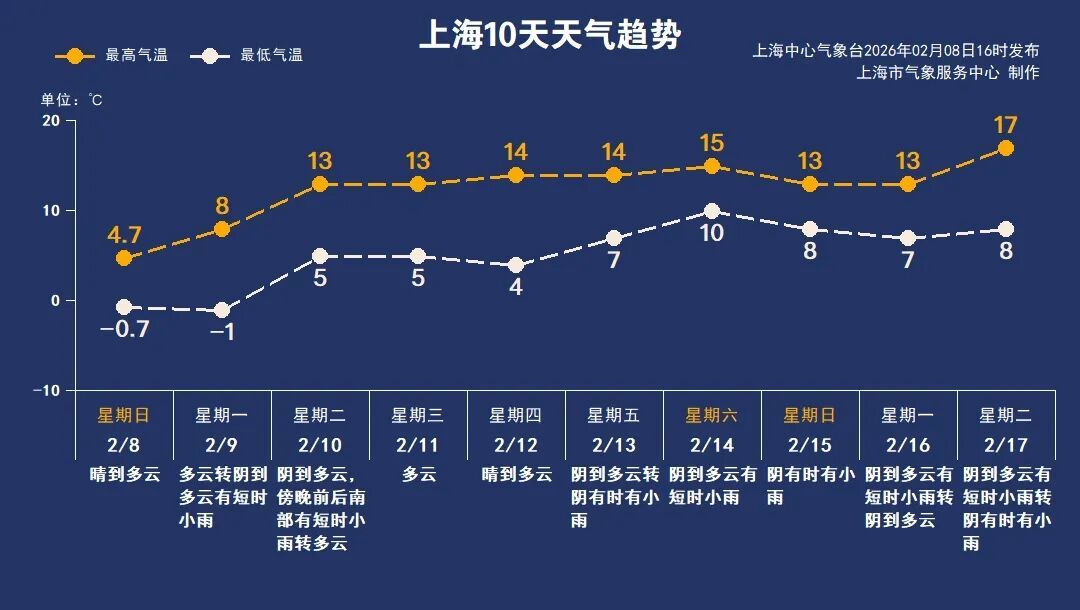 下周二上海云系较多,傍晚前后南部地区会有短时小雨,气温快速回升。周中,天气相对晴好,气温保持在4~14℃之间。下周后期,受西南暖湿气流北抬影响,上海会多阴雨天气,气温整体上升。临近春节,提醒大家及时关注最新的预报预警信息,安排好生活及出行。