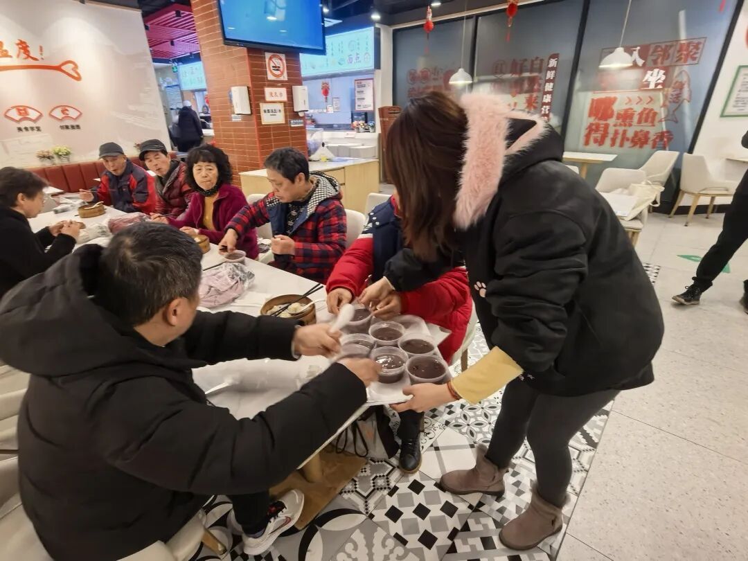 活动现场针对新就业群体,食堂精心筹备迎新联欢与专属福利,幸运抽奖送上餐饮免单券,特惠套餐驱散寒冬凉意,愿奔波的骑手们新岁龙马精神、一路平安。敬老活动中,老人们欢聚一堂,包饺子、写春联,在动手时感受传统年味,也在邻里相伴中驱散孤单,续写温情。