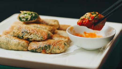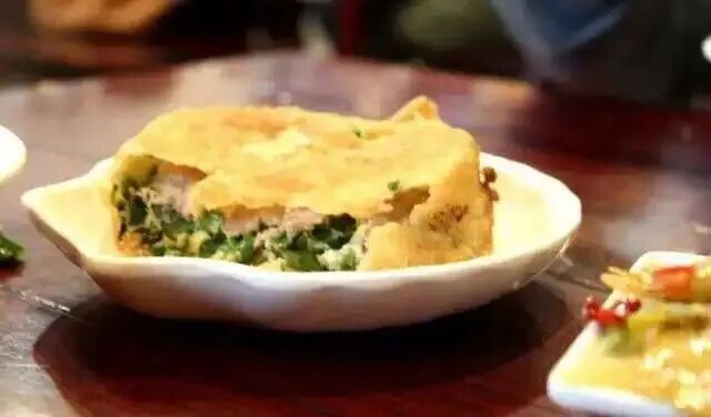 兰溪素包是形状像古钱币的小小素包。豆腐皮裹上馅儿,两面油炸,兰溪特有的大仙菜碧绿青翠,入口清香。