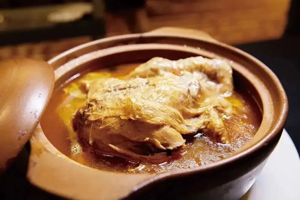 兰溪名菜神仙炖,以土鸡、猪蹄为底,佐“三两半”药材与枸杞红枣,上覆豆腐皮锁香。文火慢炖,揭盖醇香扑鼻。汤色金黄浓厚,鸡肉酥烂鲜美,是温润滋补的极致之味。