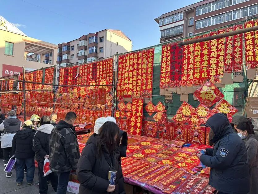 哈尔滨的年味,还藏在街头巷尾的烟火气里。春联大集上,红彤彤的春联、福字、年画铺满摊位,人们穿梭其间,挑选寓意吉祥的对联,为家门增添喜庆。