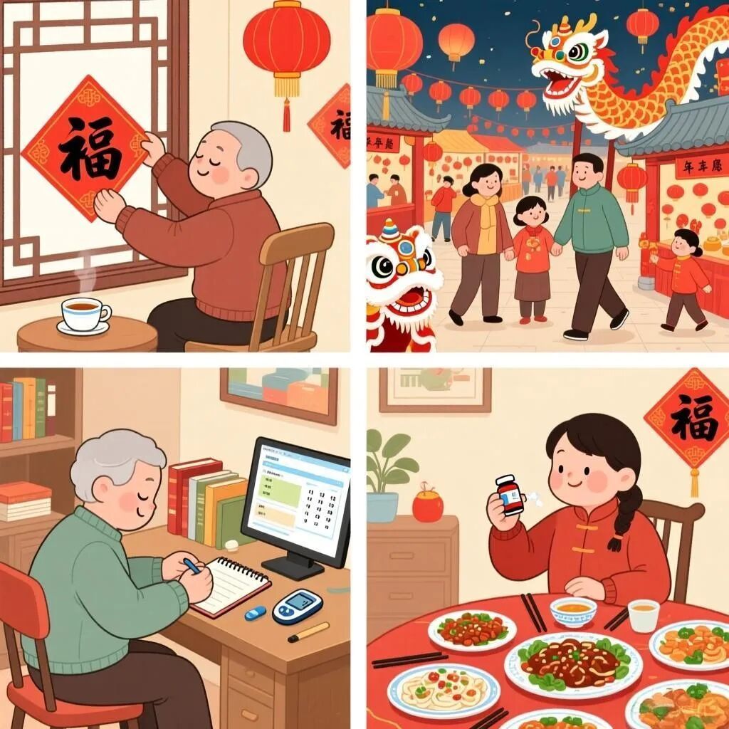 3.血糖监测比平时更勤快:春节期间饮食变化大,建议增加监测频率,特别是餐后2小时血糖。详细记录,便于掌握规律和调整。