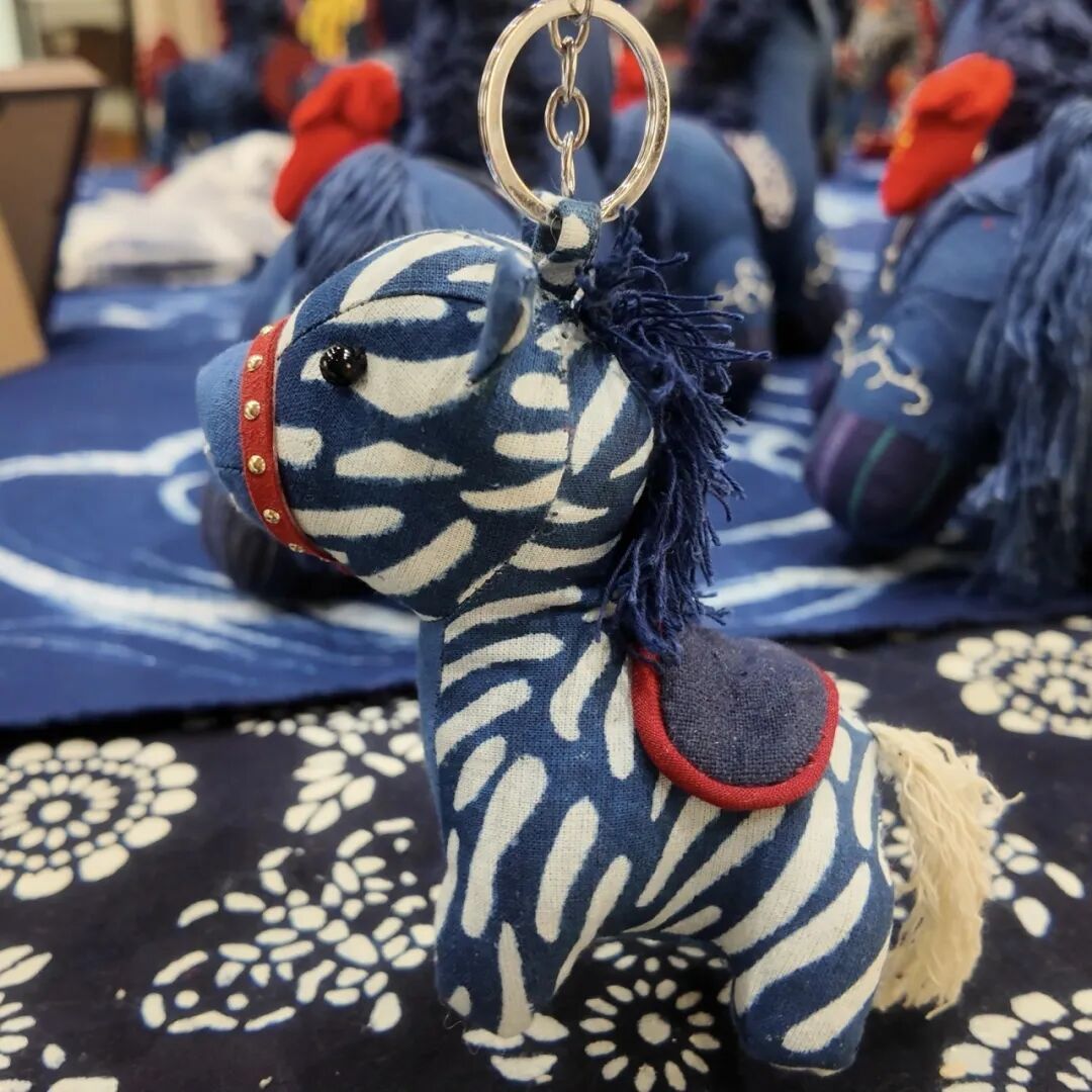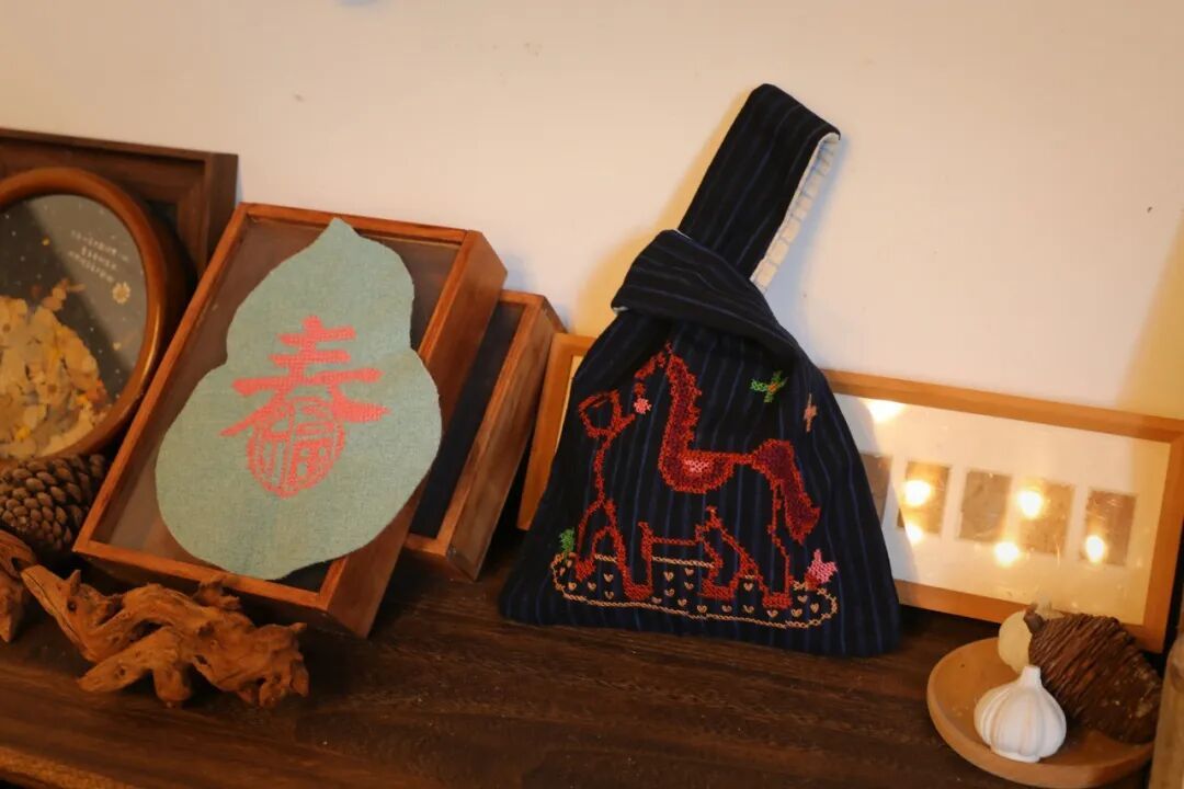 其中最引人注目的是高度仅几十厘米的“小斑马”,它以药斑布缝制马身,辅以刺绣鞍辔,每匹神态与花纹皆不相同;另有融合多民族马形图案的节气挂历,寓意“旗开得胜”,兼具实用性和观赏价值。