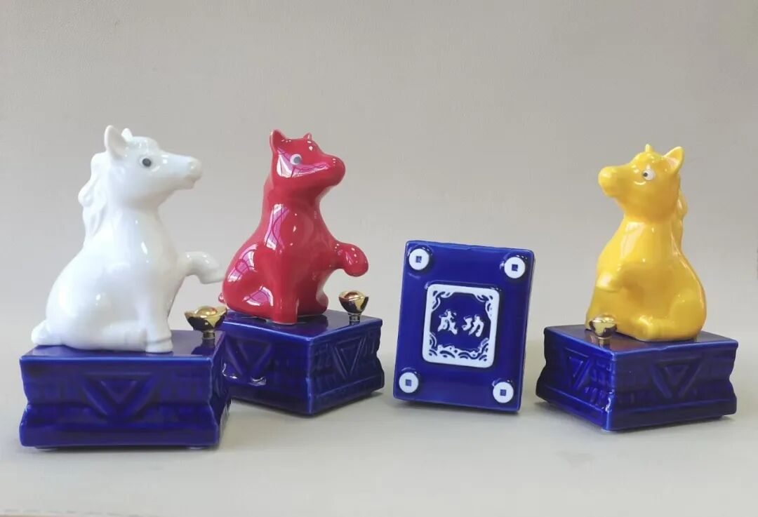 这款陶瓷摆件采用雕塑瓷非遗技艺,藏着三重吉祥巧思:倒置小马底部显“成功”二字,暗合“马到成功”的美好祈愿;足下嵌可旋转迷你金元宝,指尖轻转便似财源滚滚而来;底座铜钱纹四支点,既稳固摆件,又暗喻“四方来财、财源稳固”。