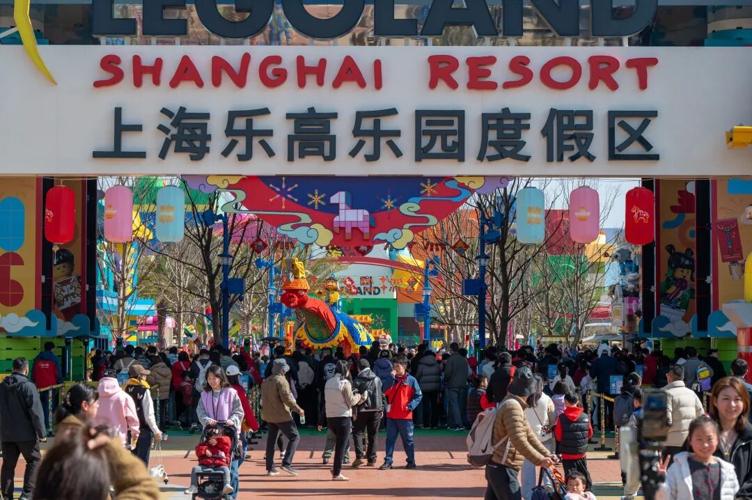 同样位于枫泾镇的上海乐高乐园度假区春节期间也迎来了大客流,上午11点左右,在乐园门口,游客陆续通过蛇形通道排队安检,而在入口处,进园的游客已经排起了小长龙,不少市民纷纷在门口拍照打卡。