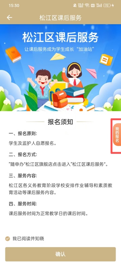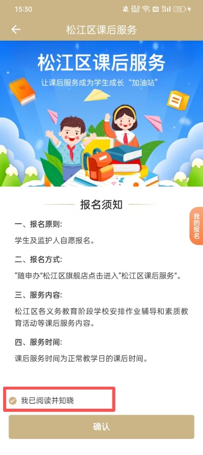 进入松江课后服务后需认真阅读报名须知,阅读完成后点击“我已阅读并知晓”进行确认。