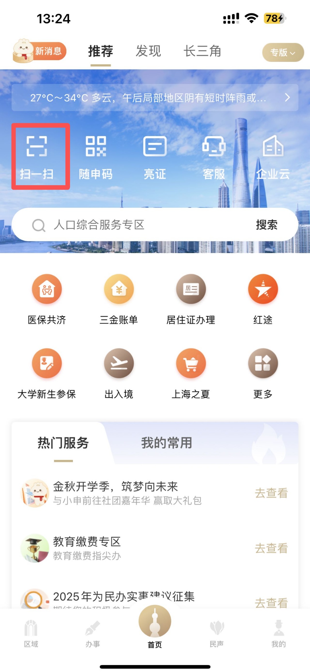 家长们可以打开“随申办”APP通过主页的“扫一扫”,扫描松江课后服务二维码进入课后服务报名页面。