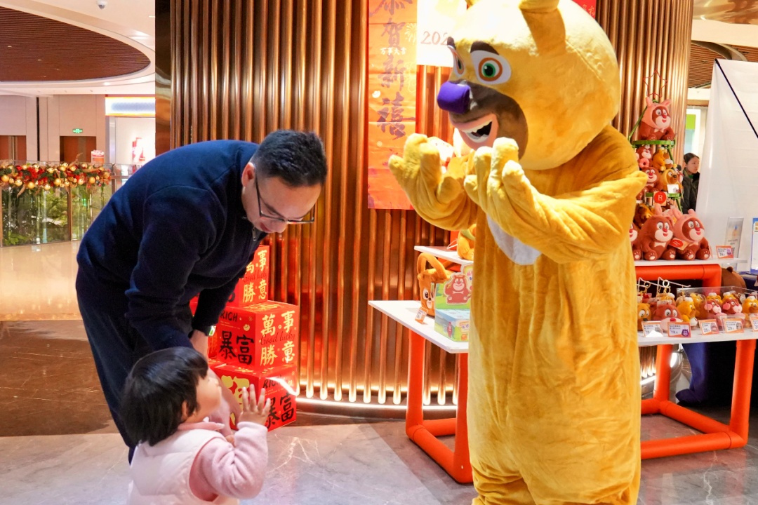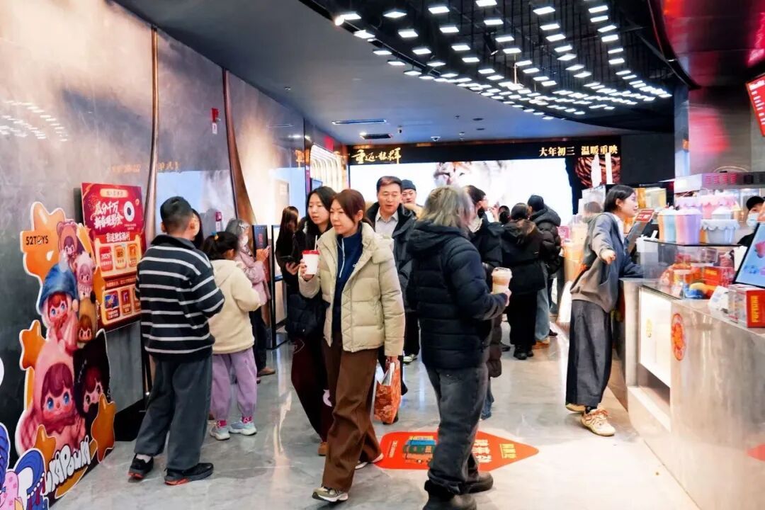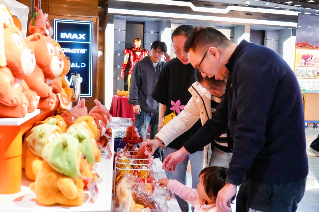 新春佳节,阖家观影成为市民休闲度假的热门选择。2026年春节档大片云集、精彩纷呈,《飞驰人生3》《惊蛰无声》等六部影片齐聚银幕,涵盖喜剧、国安、动画等多元题材,既为市民新春休闲提供了丰富选择,也有力点燃了春节电影消费热潮。 节日期间,瑞虹新天地太阳宫寰映影城迎来春节观影高峰。影院大厅内人头攒动,结伴出行的家庭、欢声笑语的亲子组合随处可见,检票、选购周边的队伍秩序井然,浓浓的年味与光影氛围交织相融,勾勒出一幅热闹温馨的新春烟火画卷。 “我今天带孩子看了《熊出没·年年有熊》,影院里好几个孩子都看哭了,我家小宝也眼泪汪汪,说太感人了,影片结束后的彩蛋时间大家都舍不得走。”带着孩子观影的李女士告诉记者,每年春节带孩子看动画电影已成为家里的固定传统,既能享受温馨的亲子时光,也能让孩子在欢乐中感受节日氛围。正在排队购票的张先生则表示,特意带家人来看《飞驰人生3》,“过年就想热热闹闹看场大片,图个喜庆好彩头,也和家人一起放松一下。” 为营造浓厚新春氛围、吸引亲子家庭观影,今年寰映影城在场景布置上别出心裁。影院大厅内,红色新春装饰随处可见,影片信息循环滚动播放;憨态可掬的熊大、熊二玩偶成为孩子们争相打卡合影的热门点位,现场设置的熊出没人偶检票员,更添几分趣味。