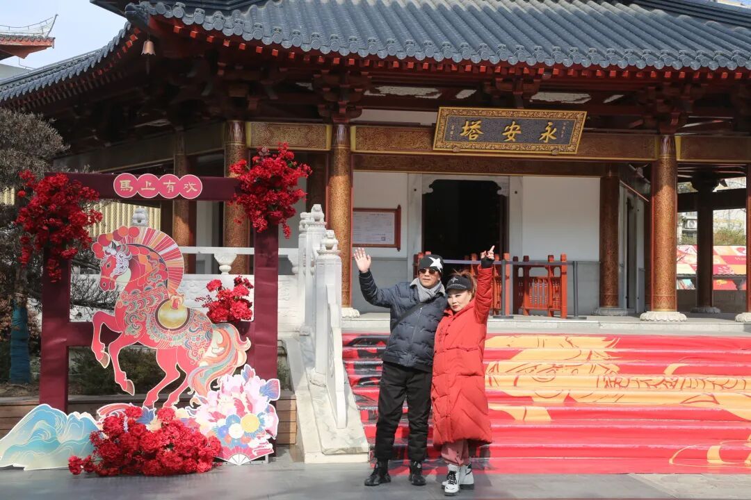 为烘托节日氛围,安亭老街进行了精心布置。景区特别设置结合马年主题的“归马迎春”装置——巧妙融合了明代文人归有光在此讲学的历史文脉。红灯笼沿河高悬,倒映水中,与古桥塔影交相辉映;入夜后,永安塔光影秀璀璨上演,传统与现代在此交融,为游客带来一场视觉盛宴。