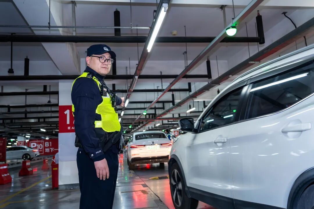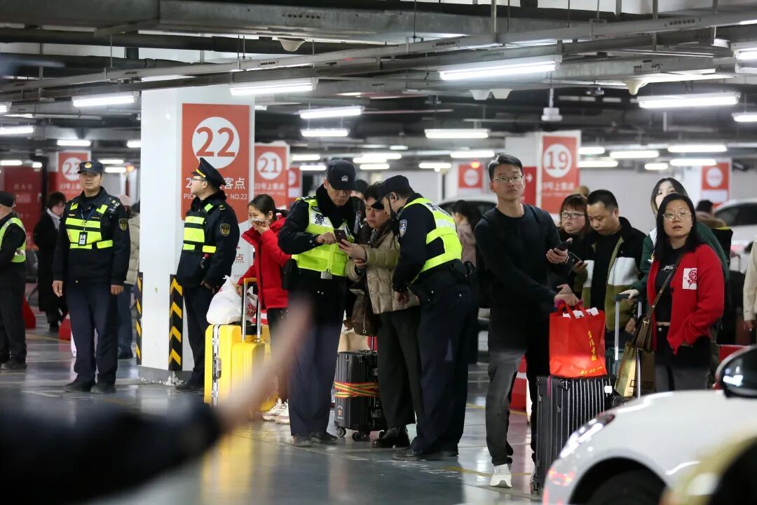 有序的背后,是警方的提前布局与精细管理。“返程高峰前,我们已经协调清空了P9、P10停车库B1层临时上客点附近的共30个车位。”在P9停车库内,新虹派出所社区警务队队长邓演刚指着不远处整齐划一的停车区说道。他的嗓音有些沙哑,春节假期中,他和警组同事们基本“泡”在了车库里。