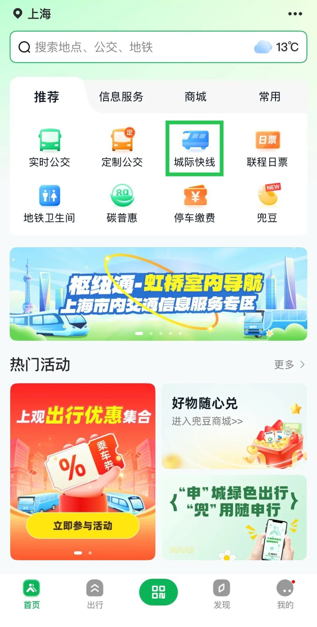 购票成功后,可在“城际快线—我的车票”中查看电子票。针对抵达虹桥枢纽的同学,在抵达当日还可以通过随申行“枢纽通”——上海虹桥站室内导航,选择“长途汽车站”步行导航。抵达上车点后凭电子二维码刷码核验上车,全程便捷高效。