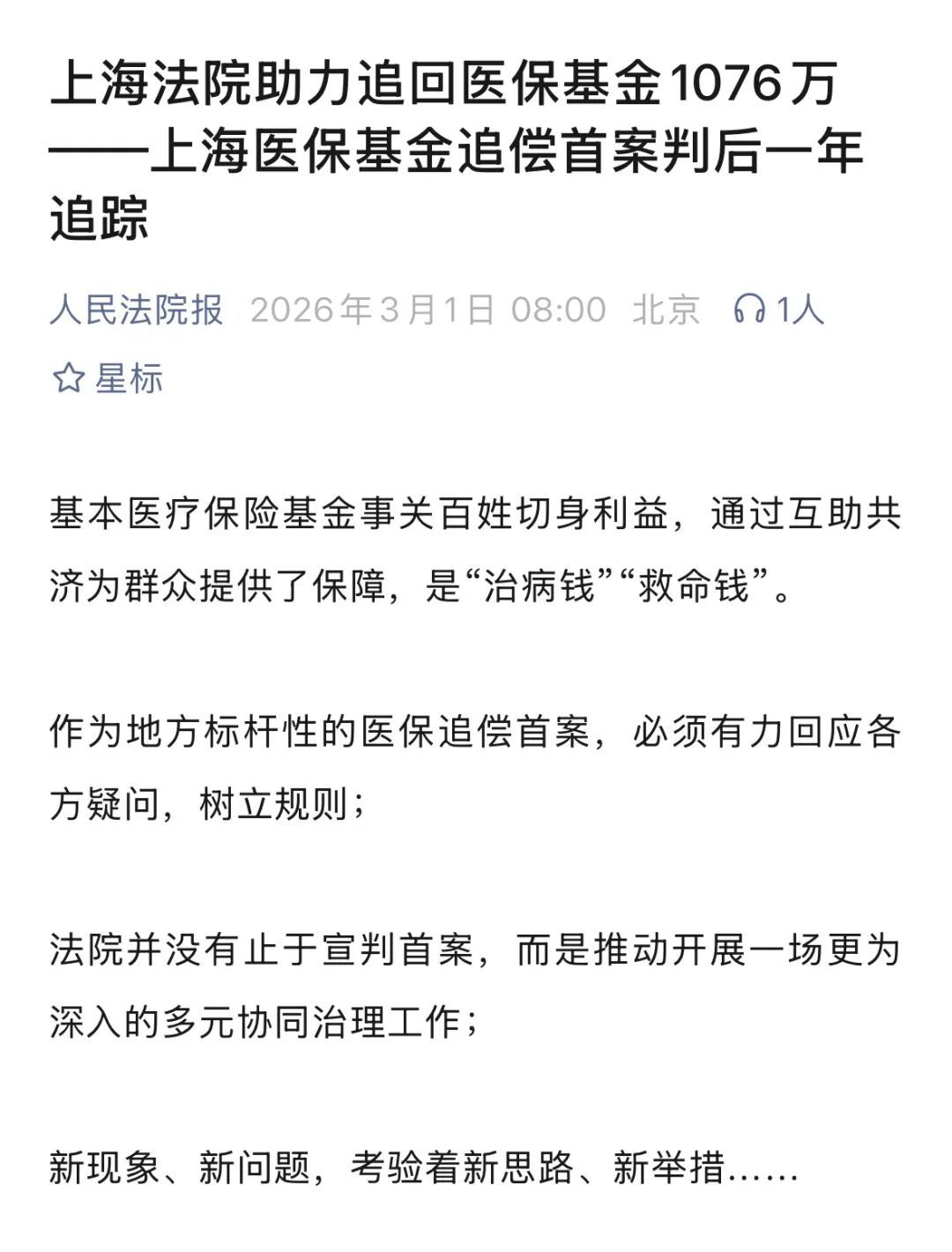 2026年上海市高级人民法院工作报告提到,2025年,上海法院助力追回医保基金1076万。