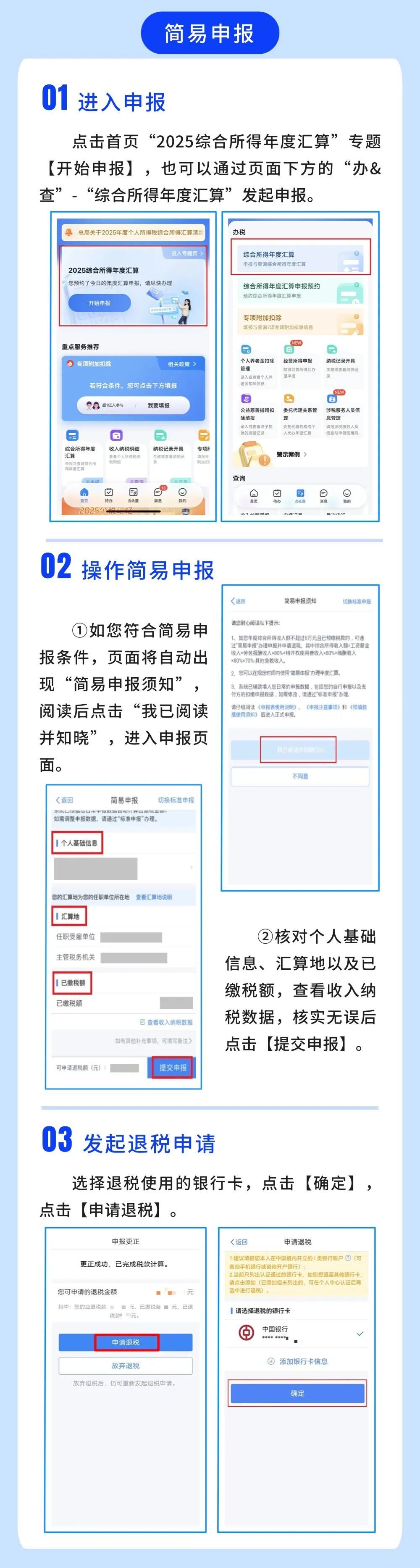 年度综合所得收入额不超过 6 万元且已预缴税款的纳税人,可通过 "简易申报" 通道直接办理退税申请。