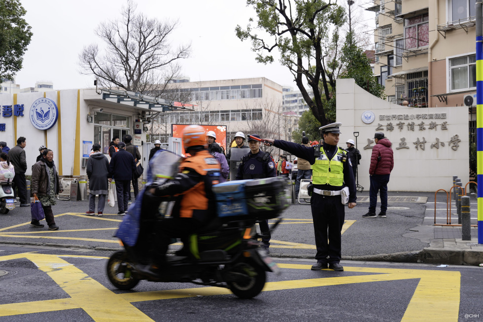 一清早,上南五村小学门口已是一派繁忙有序的景象。送学车辆络绎不绝,浦东交管支队民警早早到岗,在车流中穿梭指引,手势标准、动作利落,保障送学车辆即停即走;周家渡派出所民警驻守校门,与学校保安、志愿者协同配合,引导学生有序入校,并叮嘱骑行电动自行车的家长与学生遵守交通规则,把安全守护做细做实。