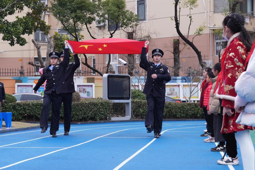 随着集合铃声响起,全校学生迅速列队、整齐有序来到操场,迎接新学期第一次升旗仪式。四名浦东公安分局青年民警代表迈着铿锵有力、整齐划一的步伐,护送鲜艳的五星红旗走向升旗台,郑重交到学生升旗手手中。雄壮的国歌声响彻校园,五星红旗冉冉升起,在场民警与全校师生共同肃立、高唱国歌,目光紧紧追随国旗,在庄严肃穆的氛围中,让爱国情怀与责任担当在孩子们心中深深扎根。