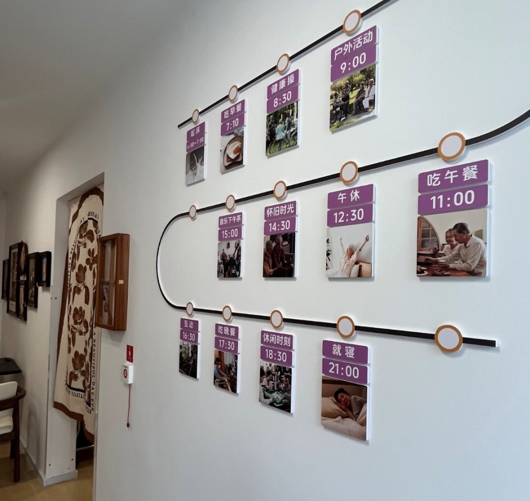 敬老院的细节处处透着记忆元素。老人房间外,张贴着图文并茂的时间表,提醒什么时间该用餐了,什么时间该睡觉了。床头、卧室门口布置着“个人记忆盒”,里面放着家属准备的旧照片等。对认知障碍老人来说,这能帮助他们认出“这是我的房间”“这是我的床”。