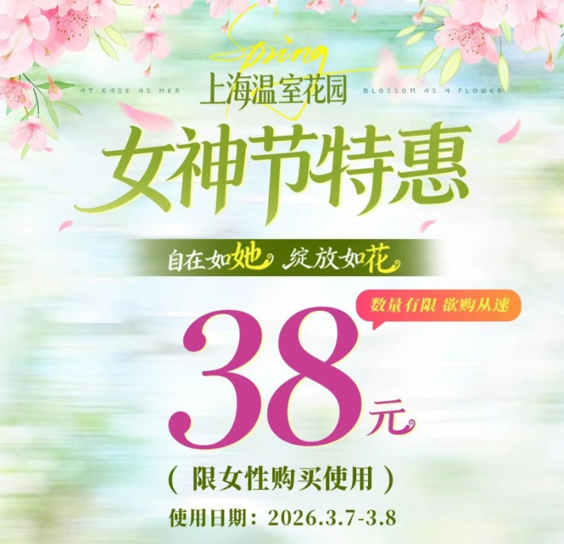 在这个专属于女性的节日,各位姐妹有机会以38元的优惠价畅游温室花园,目前已在小程序、美团、携程、同程、麦淘同步开售,使用期3月7日-3月8日,上海温室花园营业时间可用。