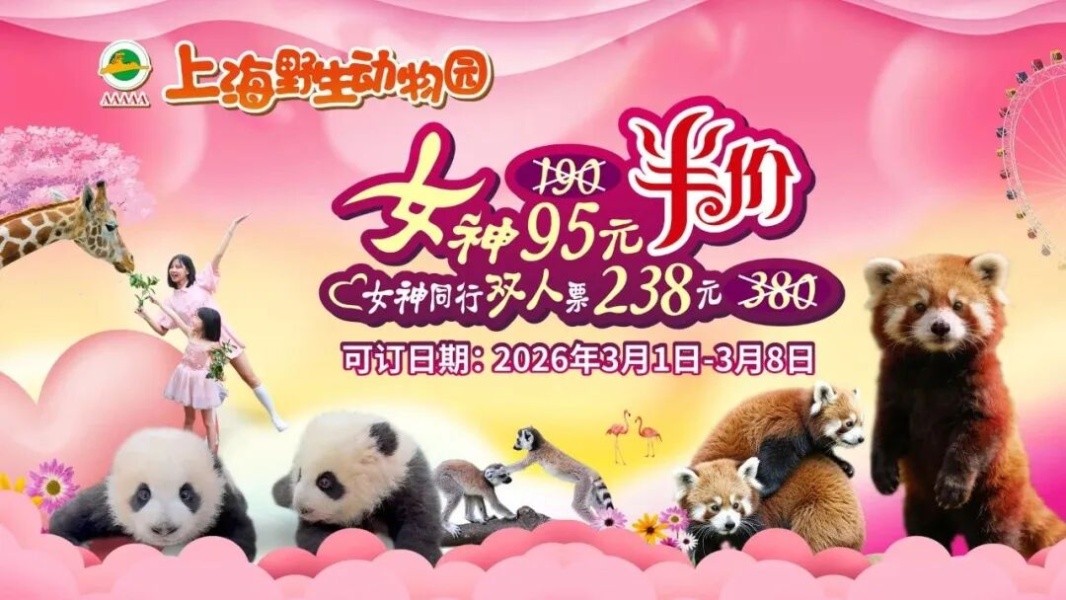 为了迎接“三八”国际妇女节,上海野生动物园推出女士专属半价礼遇。女士专享票半价95元;女士同行双人票特惠238元(至少含1位女士);家庭票特惠298元(2位成人+1名1.3米-1.5米儿童)。使用时间为即日起至3月8日,女士半价票和女士同行双人票为女士专享,购票需填写女士身份证信息,并刷女士身份证原件入园,最晚可订时间为游玩当日10点前。