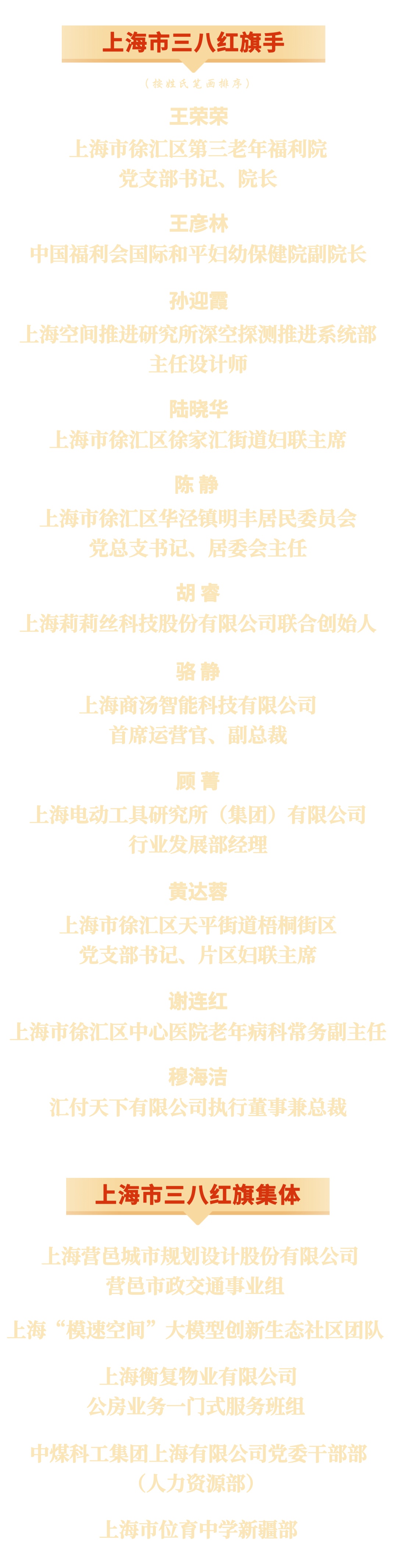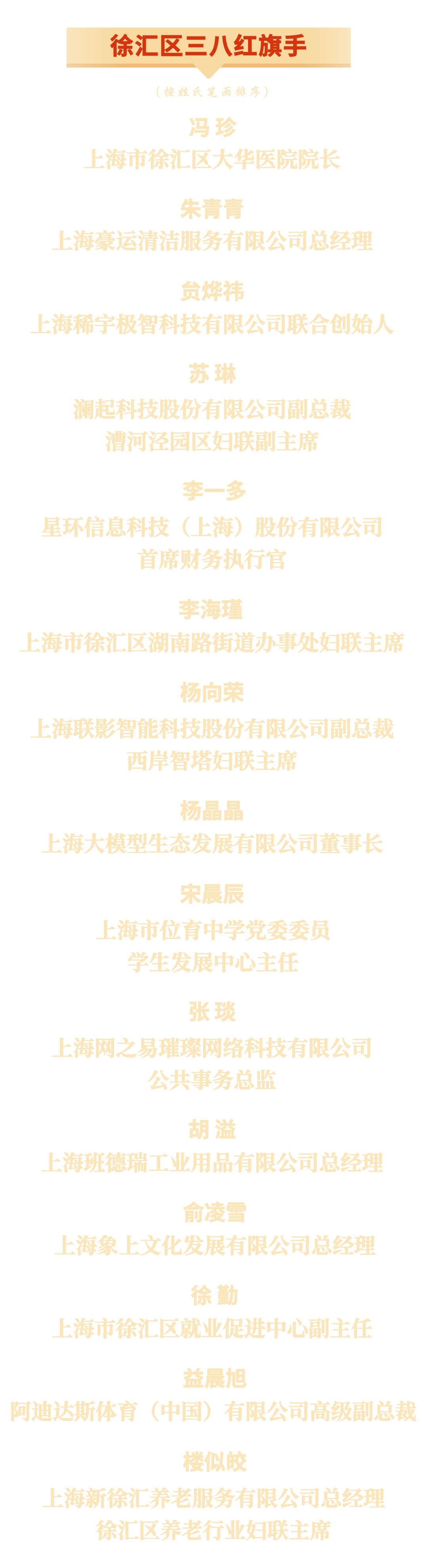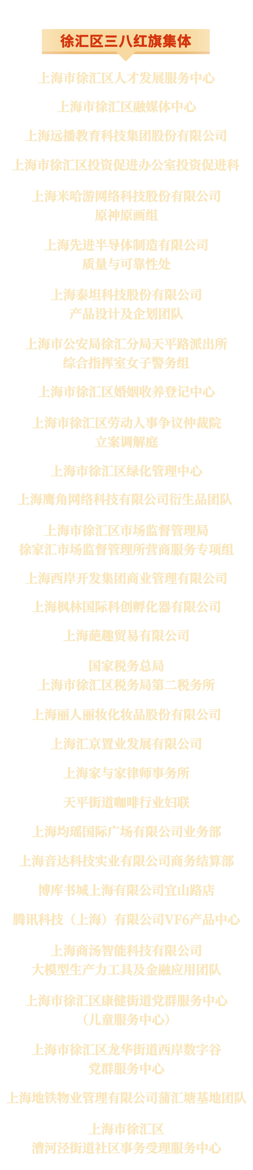 在徐汇,众多锐意进取、奋发有为的优秀女性与女性集体,在全面落实国家重大战略、推动高质量发展中贡献巾帼智慧与力量,在奋力开创徐汇社会主义现代化建设新局面中立新功、创佳绩,以柔肩扛起责任,用坚韧诠释担当,成为推动区域发展不可或缺的“她力量”。2025年度全国三八红旗手全国巾帼文明岗2022—2024年度上海市三八红旗手(集体)2024—2025年度上海市“最美巾帼奋斗者”徐汇区三八红旗手(集体)