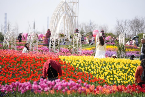 3月,16万株郁金香竞相绽放,红的、黄的、紫的、粉的交织成一片大地彩虹,漫步在奇迹花毯上仿佛闯入彩色星河;4月,紫藤花垂帘漫花堤,一串串紫色的花穗随风摇曳,香气扑鼻,还有各色月季缠绕成的唯美拱门,其中一株三色月季更是自带吸睛属性,芬芳馥郁间尽显春日风情。