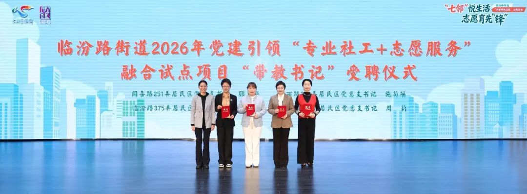 现场,闻喜路251弄居民区、汾西路261弄居民区、临汾路375弄居民区、阳曲路760弄居民区分享了2025年度党建引领“专业社工+志愿服务”融合案例,还发布了2026年度临汾路街道“社志融合”试点项目。同时,为四位居民区书记颁发“带教书记”聘书,推动试点经验传承,深化融合成效。