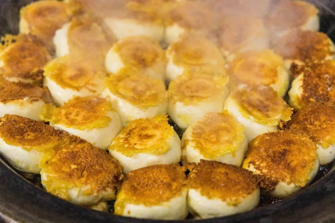 期间不断转动铁锅翻动煎包