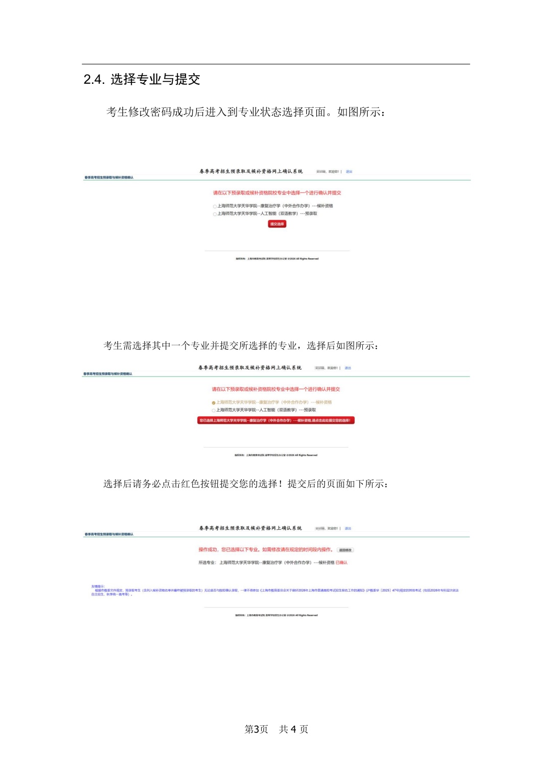 2. 打开网上确认系统后,根据系统内“上海市普通高校春季高考招生预录取与候补资格网上确认系统操作手册”具体指导步骤,进行网上确认。