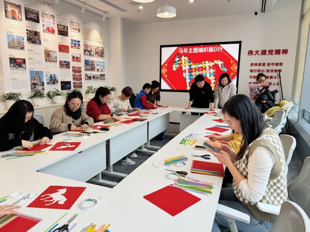 马年主题编织画DIY活动中,手工老师细致示范十字编织技法,白领们在一编一织间专注心神,将新春美好寓意融入作品,在动手创作中舒缓开工焦虑,收获成就感。
