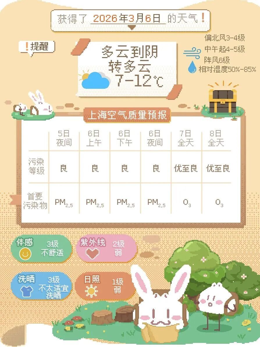 受冷空气扩散影响,今天(3月6日)早间气温多在7~8℃上下,白天多云到阴,偏北风3~4级,中午起增大至4~5级阵风6级,沿江沿海地区5级阵风6~7级。预计今天最高12℃,气温不高,注意保暖,相对湿度80%~30%。