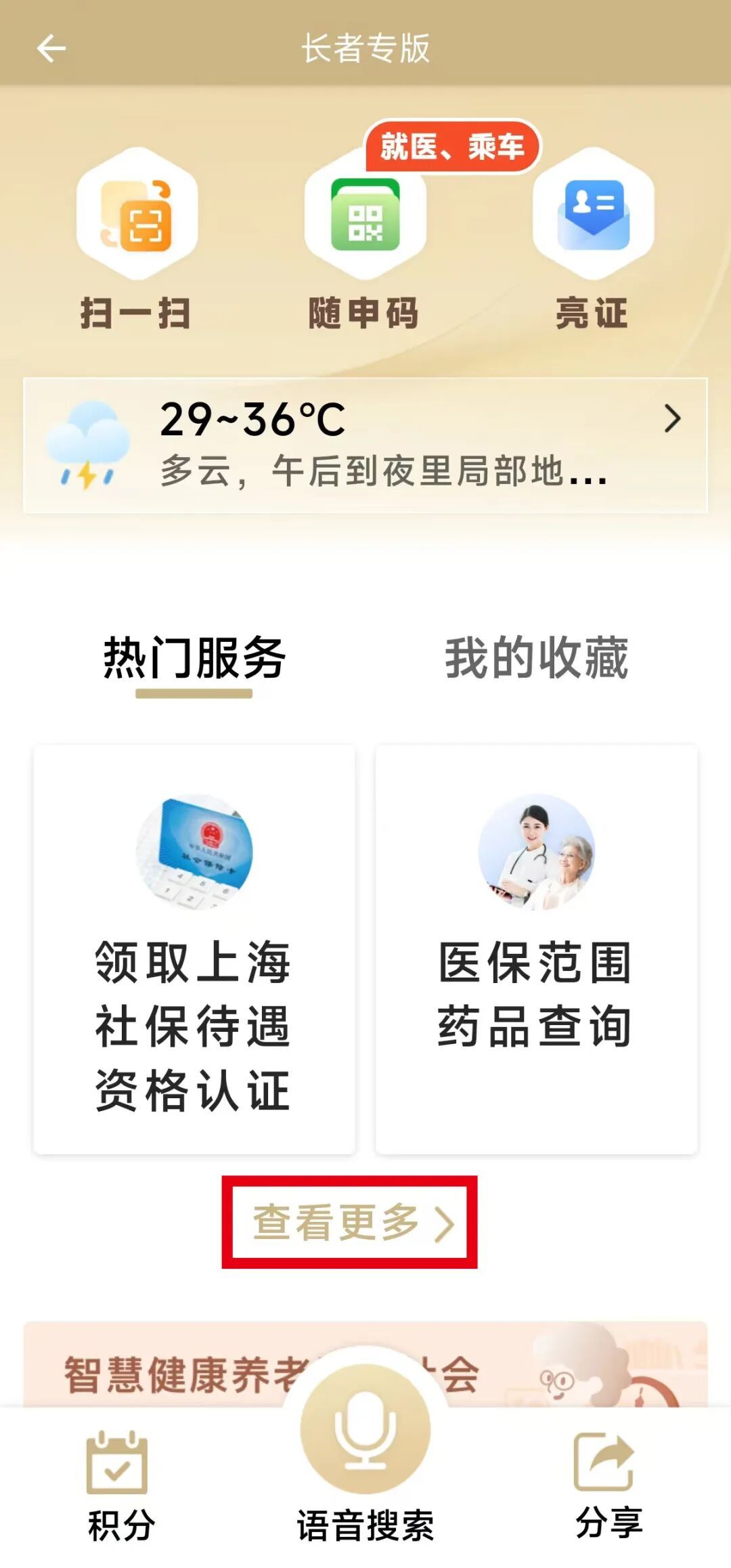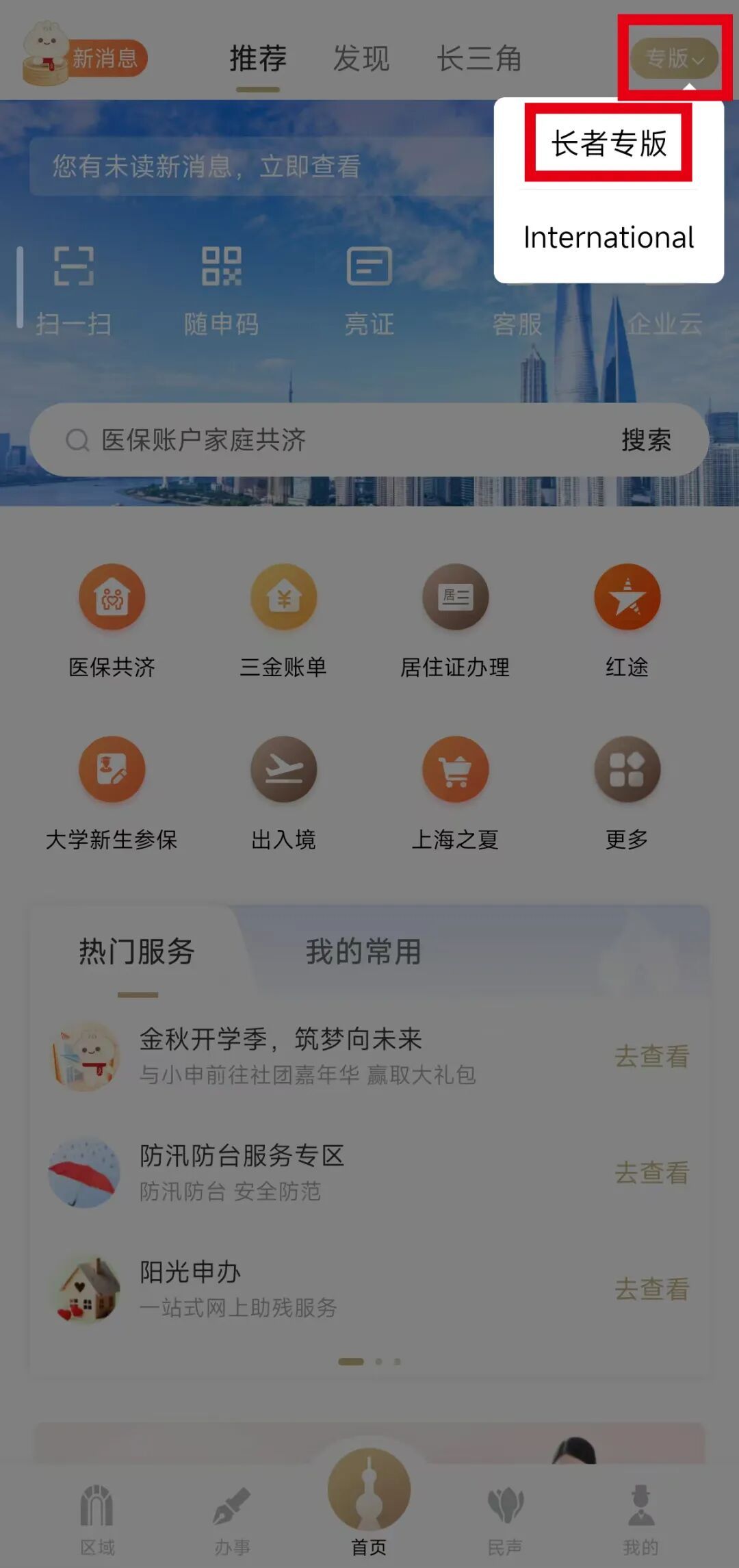 通过微信小程序搜索并打开“随申办”(或通过支付宝进入“随申办”、或“随申办”APP直接进入),点击主页右上角的“专版”,然后点击“长者专版”: