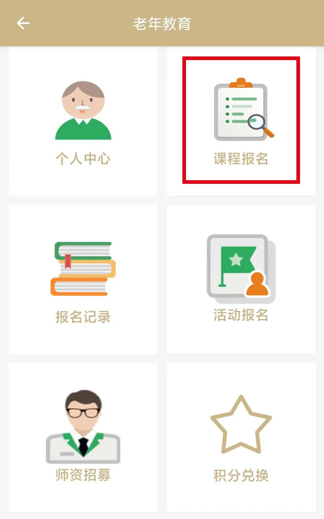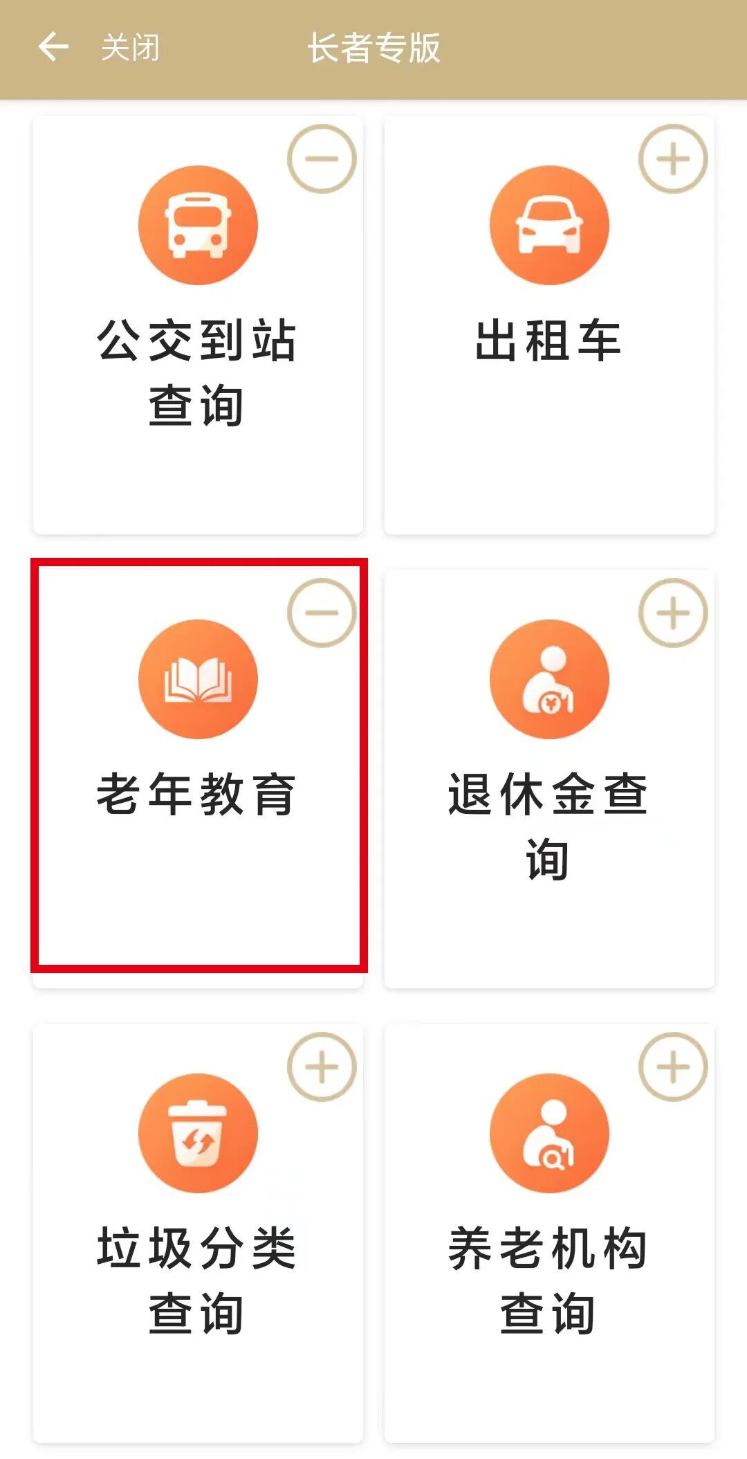 在长者专版的页面中,点击“查看更多”,再点击“老年教育”: