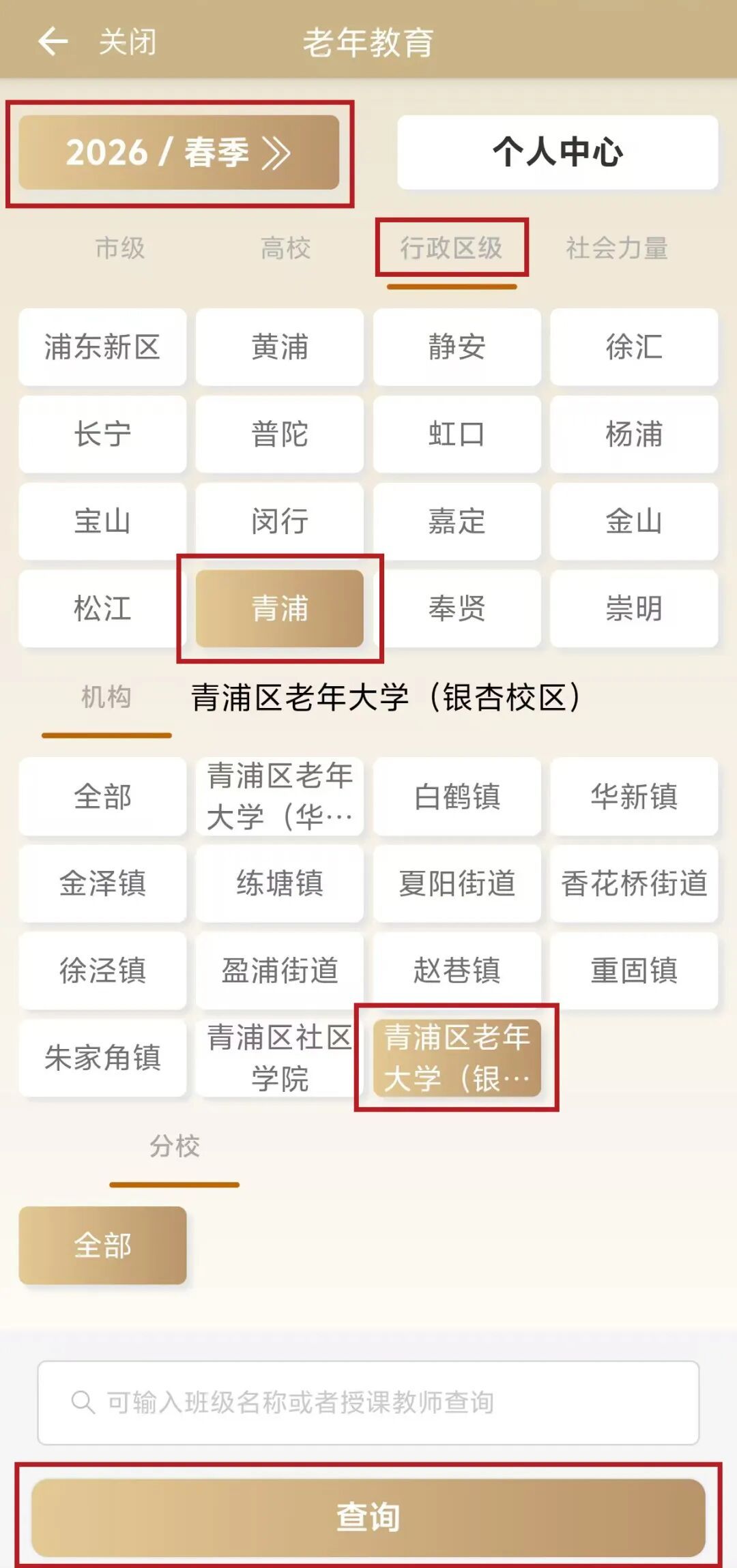 在课程报名页面中依次点击:“2026/春季”、“行政区级”、“青浦”、“青浦区老年大学(银杏校区)”,然后将页面拉到最下方,点击“查询”: