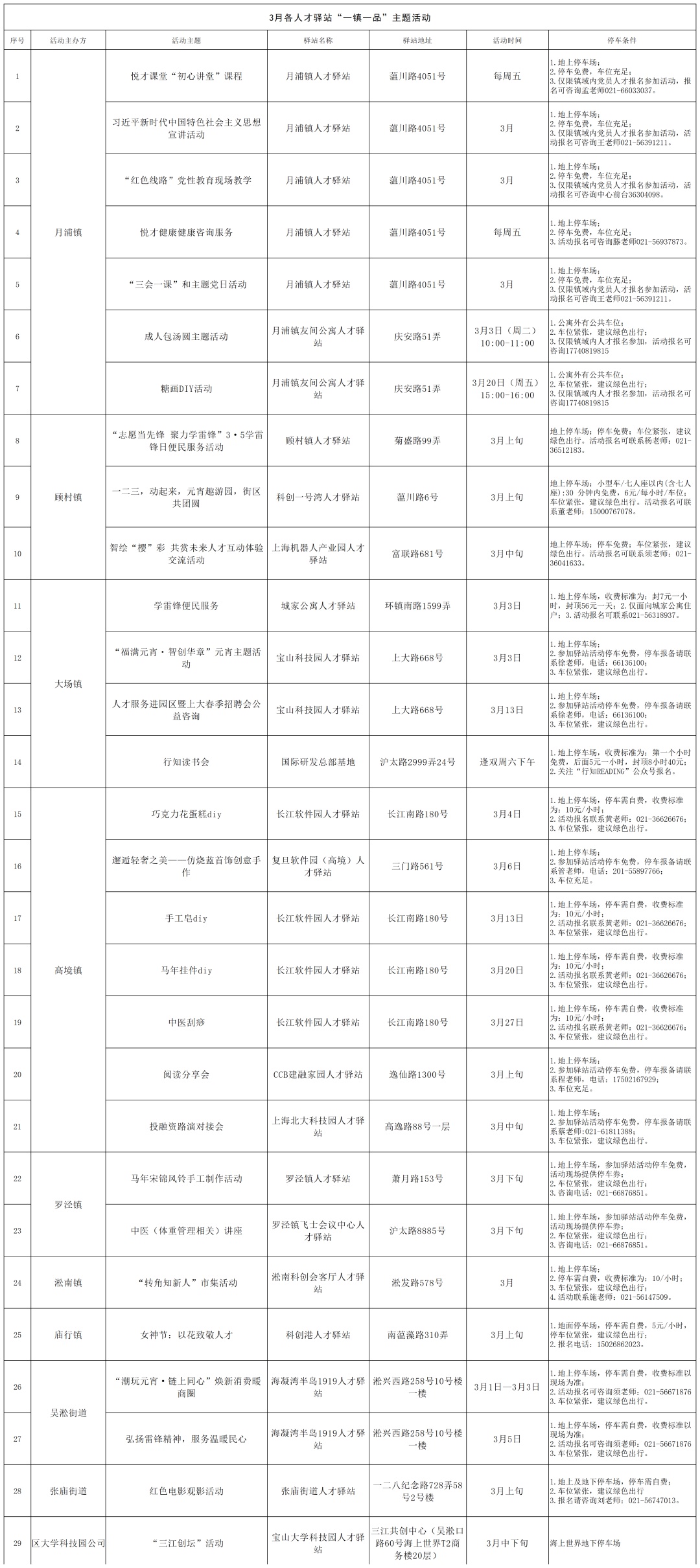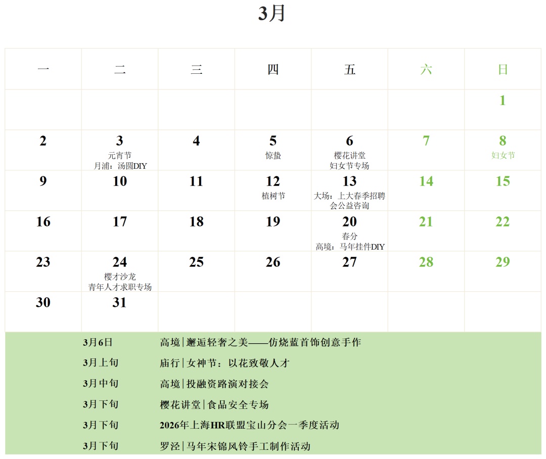 春归万物生 世间美好悄然苏醒 宝山人才月历·3月刊,邀您共赏春光 二月精彩回顾 SPRING 2月3日,由宝山区人才工作局主办、中国人寿宝山支公司承办的“融无界&创未来——金融护航英才”主题活动成功举办,宝山区首家金融主题人才驿站同步正式启用,50余名区内人才工作者代表共同出席本次活动。 具体内容详见下方推文: 金融护航英才 服务直达一线!宝山区首家金融人才驿站正式启用 2月5日下午,宝山区人才工作局在上海国创碳基纳米材料研究所开展了人才健康养生暨政策解答上门服务活动。现场氛围热烈,20余名企业人才积极参与八段锦学习。人才服务专员还现场细致解答人才政策相关疑问,切实提升辖区企业人才的归属感、获得感与幸福感。 具体内容详见下方推文: 【樱花讲堂】人才养生活动国创碳铖专场顺利举办 三月精彩预告 SPRING “人才有约,四季相伴—樱花讲堂”系列活动——妇女节专场 活动对象: 区重点服务企业、区属国有企业,以及街镇(园区)推荐企业中的人力资源部门女性负责人等。 活动时间: 3月6日 活动地点: 宝山区园新路258弄城工科技绿洲4号楼1楼党群服务中心 停车条件: 免费停车,活动咨询及报名请联系李老师:021-56103450。 活动内容: 围绕区内重点企业女性人才关心的养生知识开展培训活动。 “人才有约,四季相伴—樱才沙龙”主题活动——青年人才求职专场 活动对象: 宝山区及周边知名大学的青年人才,区属国有企业,以及街镇(园区)推荐的青年人才等。 活动时间: 3月24日 活动地点: 宝山科创人才港一楼大厅(同济路666号) 停车条件: 建议绿色出行;活动咨询及报名请联系李老师:021-56103450。 活动内容: 开展青年人才喜闻乐见的求职赋能活动,现场推介青年驿站求职免费住政策,提供免费打车券等活动奖品。 “人才有约,四季相伴—樱花讲堂”系列活动——食品安全专场 活动对象: 区重点服务企业、区属国有企业,以及街镇(园区)推荐企业中的人力资源部门负责人、HR等。 活动时间: 3月下旬 活动地点: 宝山科创人才港一楼大厅(同济路666号) 停车条件: 建议绿色出行;活动咨询及报名请联系李老师:021-56103450。 活动内容: 围绕区内重点企业人才关心的食品安全问题开展专题培训活动。 “人才有约,四季相伴” 2026年上海HR联盟宝山分会一季度活动 活动对象: 区重点企业人力资源部门负责人及HR等。 活动时间: 3月下旬 活动地点: 宝山区一二八纪念路728弄58号2号楼 停车条件: 免费停车,活动咨询及报名请联系李老师:021-56103450。 活动内容: 邀请实战派讲师,提供《薪酬管理体系优化》深度培训。 此外 3月宝山区各人才驿站 “一镇一品”主题活动也已新鲜出炉 诚邀广大人才积极参与 另外,各街镇(园区)和相关主管单位 3月人才服务日活动也已准备就绪 欢迎来访 享受就近办件、政策咨询、落户规划 和关键小事等一揽子服务 说明: 1.以上活动主要面向经认定的宝山区人才服务重点企业,或注册在宝山区的科技型、成长型以及留学人员(海外人才)企业,具体活动安排及参会情况请以实际情况为准。 2.宝山区各人才驿站“人才服务日”活动,均由区人才发展服务中心选派区级人才服务专员独立或组团式开展,符合条件的本区企业,可派员就近参与,或参加毗邻区域“人才服务日”活动。 3.咨询电话:宝山区人才发展服务中心 021-56103450。 为深化宝山人才服务阵地建设,持续丰富课程品类与内容,不断满足宝山区各类人才对于知识、专业、技能等素养提升的需求,现面向全社会征集课程资源,构建专业性、实战性、创新性的《宝山人才·课程谱系》。 征集范围:课程征集涵盖多个领域,包括但不限于劳动保障类、政策法规类、经营管理类、创新发展类、金融财税类、文化艺术类、运动健康类、人文素养类等。课程免费且不用于任何营利目的。 课程受众及授课地点:主要用于樱花讲堂等区级人才品牌活动,面向人群为在宝山工作的企业负责人、HR等行政人员、新入区青年人才、中青年骨干人才,以及其他在宝山企业和社会组织创新创业的人才;授课地点主要在宝山区域范围内。 如您有意申报,请扫码填写课程申报表(见附件)并加盖单位公章后,发送至邮箱:bsyhjt@126.com。
