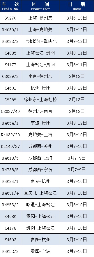 据中国铁路上海局集团有限公司介绍,根据旅客出行需求,铁路部门恢复和增开了部分旅客列车,赶快过来看看,有没有您需要的车次。 部分列车恢复开行统计截止日:3月5日 增开列车 统计截止日:3月5日