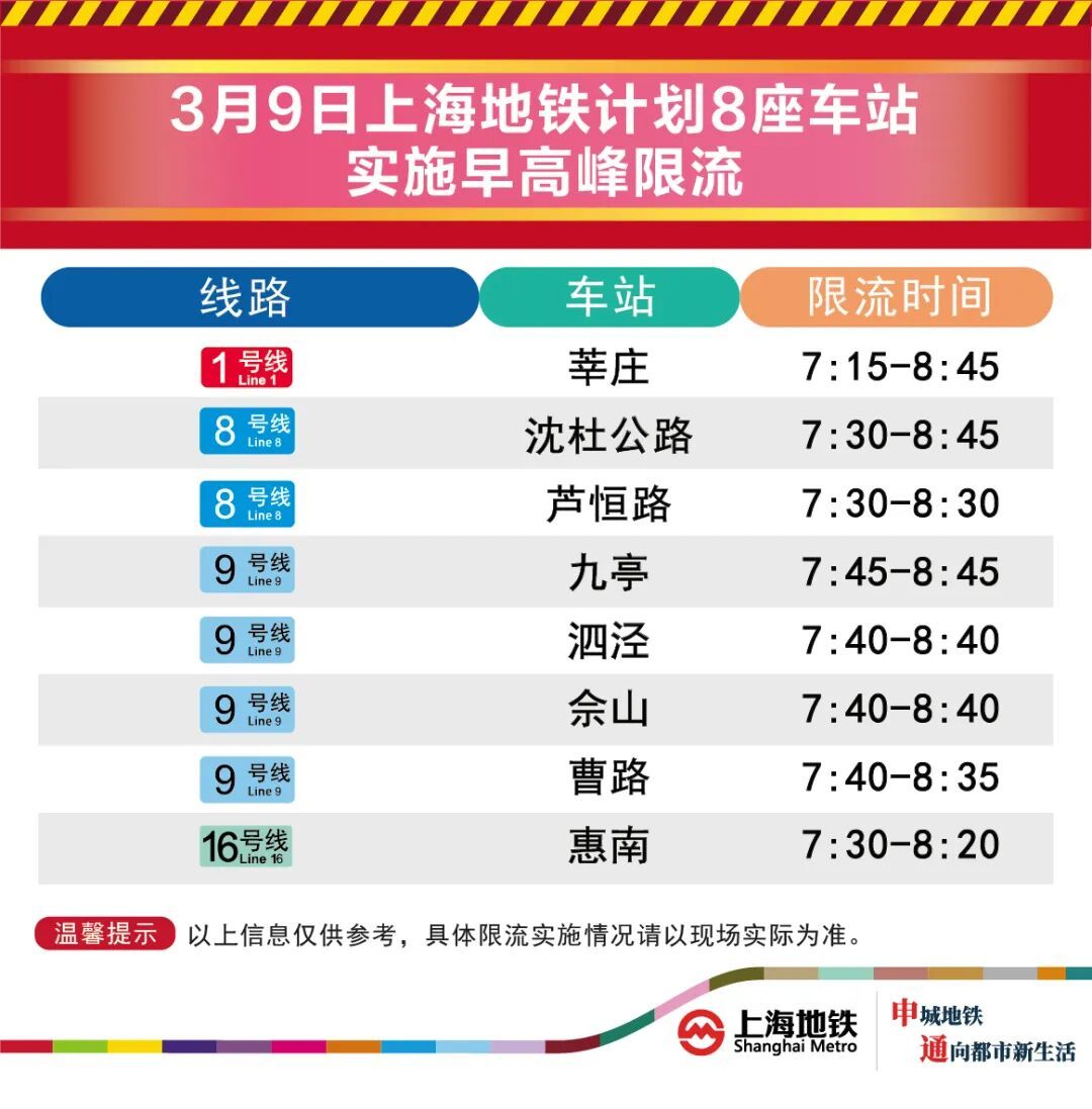 3月9日早高峰莘庄、沈杜公路等8座地铁站计划限流