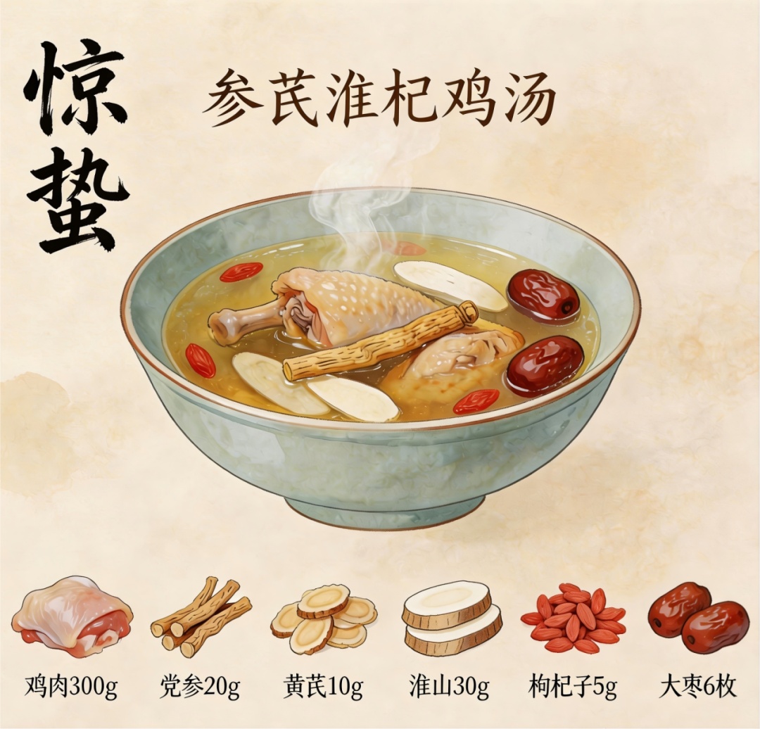 今天让我们试试这份惊蛰药膳美食——参芪淮杞鸡汤