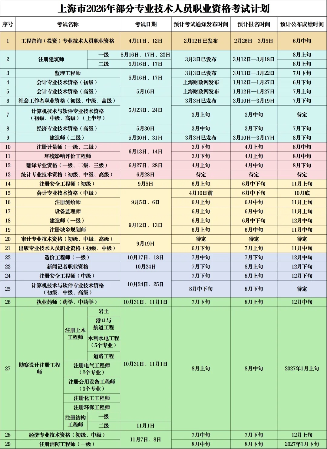 新的一年,新的征程!上海市2026年度部分专业技术人员职业资格考试计划正式发布!考试计划中包括29项考试,时间安排一目了然,重要事项全面知晓,赶紧收藏,规划你的提升之路吧! (点击图片可查看大图)