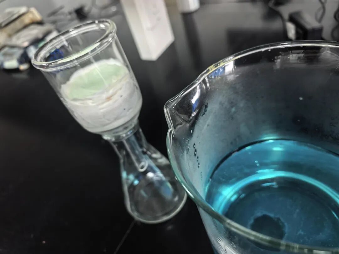 在实验室中,科研人员聂雨萱向记者展示了材料的吸附测试过程:采用铜离子溶液替代铀离子溶液模拟吸附场景,材料通过表面官能团精准识别并“抓取”铜离子,原本浑浊的液体经过材料吸附后,下方滴出清澈透明的液体。