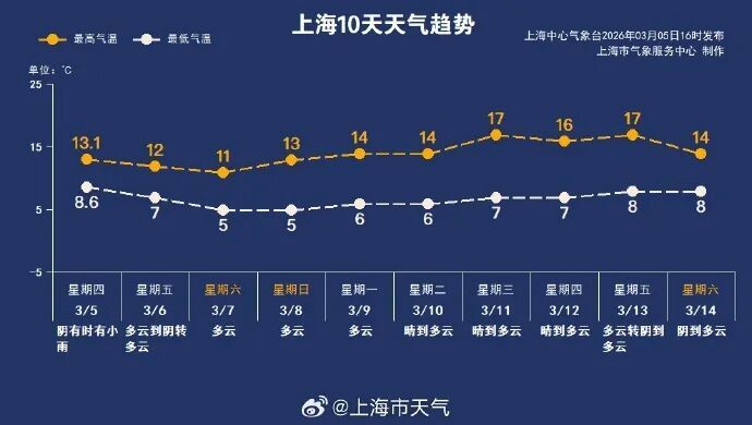 受高空西北气流控制,双休日申城是多云天气,最低气温5℃左右,郊区更低一些,最高气温11~13℃。阳光上岗后,白天体感会舒服一些。下周延续晴好天气,最高气温逐日回升,预计下周中后期申城的最高气温可升至16~17℃,最低气温在6~8℃,早晚偏冷,白天晴暖舒适,需谨记洋葱式穿衣法。