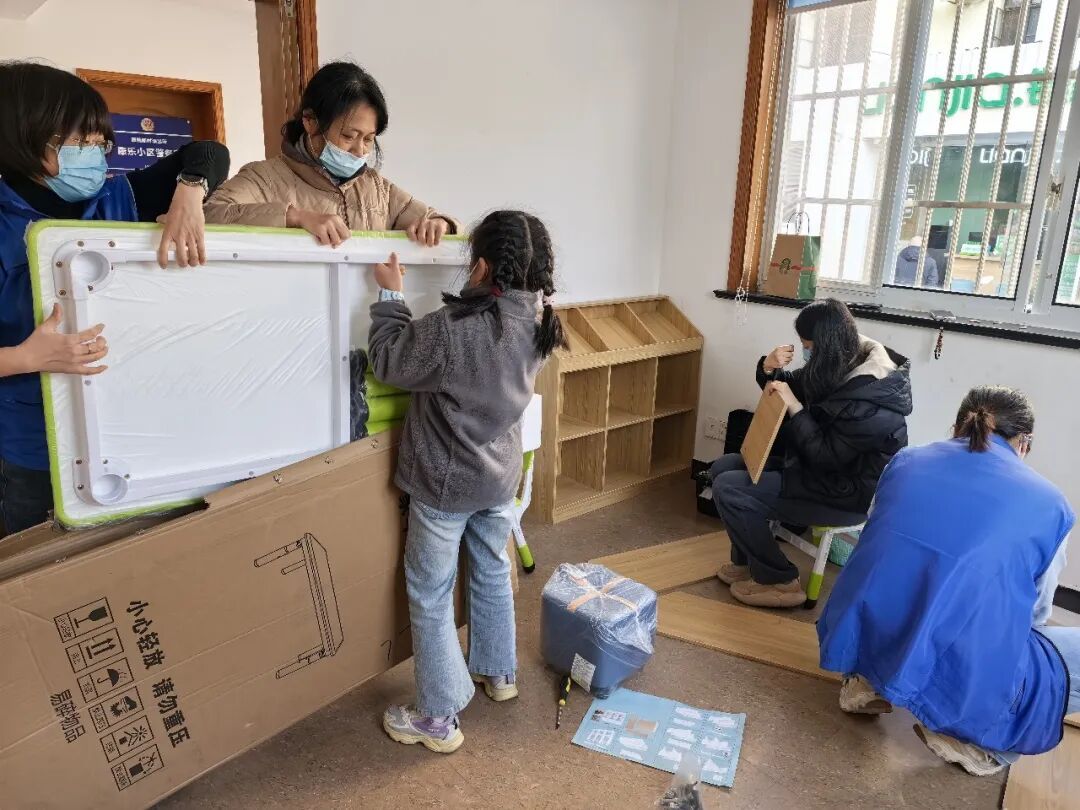 不同于专业施工改造,书房焕新全靠居民“自己动手”。去年12月,一场持续两周的“开荒行动”悄然展开,十几位居民带着孩子主动参与,没有施工队和专业监理,大家分工协作组装书柜、搬运书籍、清理杂物。陈盈发挥童书作家专长,规划阅读区、分类书籍;颜丽杰凭借园林设计师经验,打造绿植角、布置墙面;王婷婷则用卡通设计和手工活动为书房添彩。