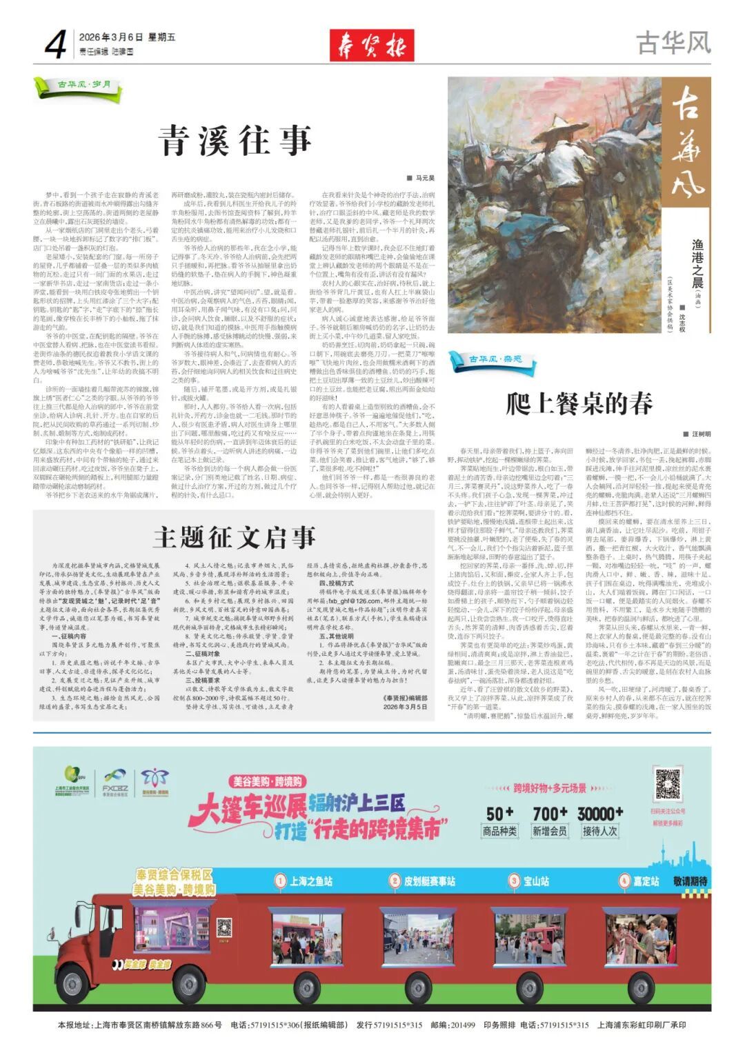 1.作品将择优在《奉贤报》“古华风”版面刊登,让更多人通过文字读懂奉贤、爱上贤城。 2.本主题征文为长期征稿。 期待您的笔墨,为贤城立传,为时代留痕,让更多人读懂奉贤的魅力与担当! 《奉贤报》编辑部 2026年3月7日