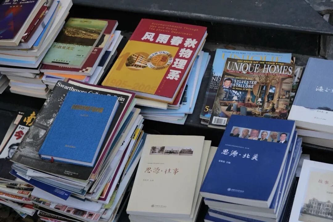 抵达现场时,眼前是一派热火朝天的搬家景象。院子的一边堆了很多生活杂物,另一边则堆了几摞书。《小团圆》《宇宙到底是有限的还是无限的》《风雨春秋物理系》……与想象不同,除了几本通俗小说,剩下的几乎都是科普读物、英文杂志、校友刊物以及学术期刊。