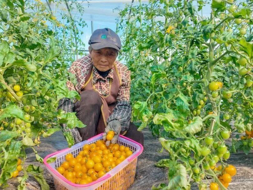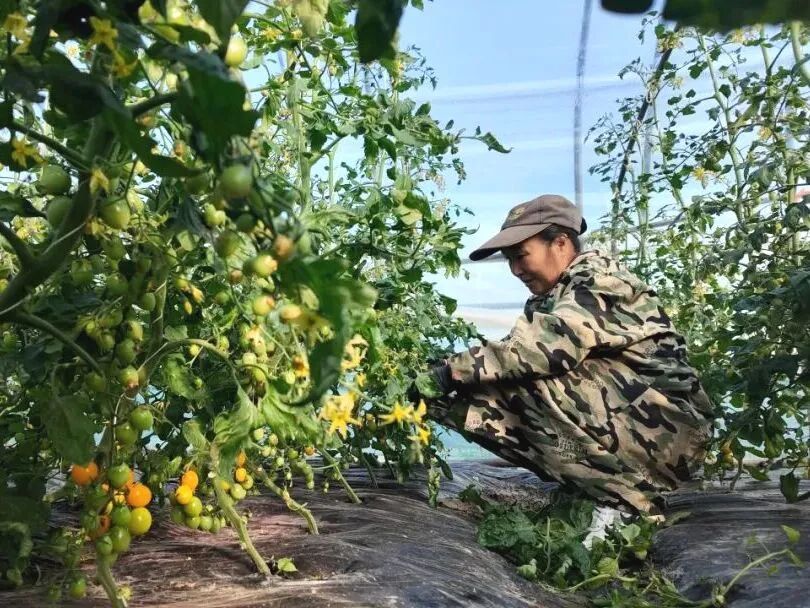 一大早,合作社负责人刘海龙便穿梭在一排排番茄架间,查看长势、精心采摘。翠绿的藤蔓顺着支架攀爬生长,叶片茂盛,一颗颗小番茄在枝叶间若隐若现,饱满圆润,凑近便能闻到淡淡果香。
