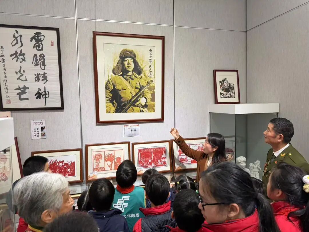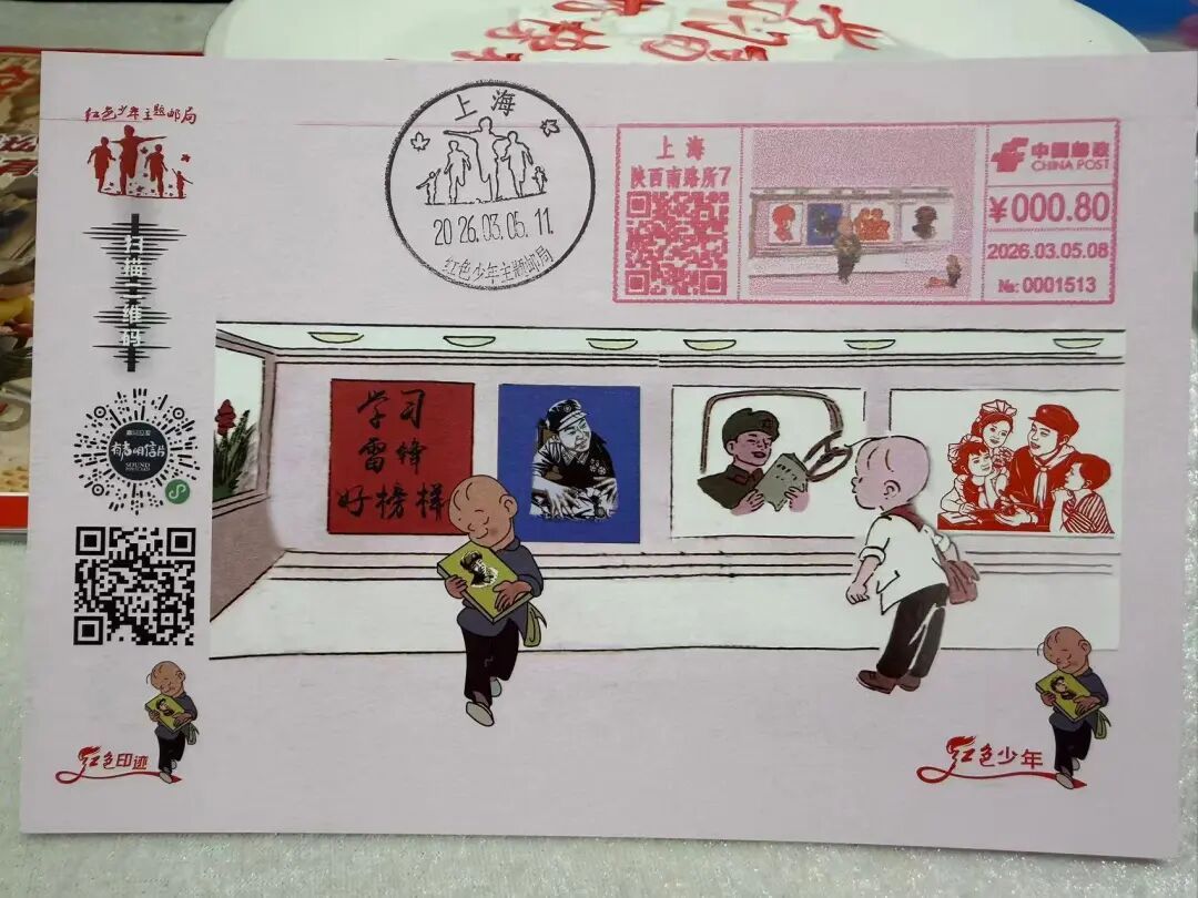 近日,上海红色少年主题邮局正式发行《雷锋》邮资宣传机戳。当天一早,该邮局向全国六十多家少年邮局寄送了《雷锋》主题明信片,并为部分红色场馆及雷锋纪念馆寄去了《雷锋》有声火柴空盒,以此纪念这位时代楷模。为配合此次发行活动,一场别开生面的学雷锋主题教育活动在宝山区淞南镇党群服务中心的新时代红色陶瓷艺术馆举行。来自宝山区好时光小拇指幼儿园、杨浦区凤城新村小学(凤城少年邮局)、上海交通大学附属黄浦实验小学(中国共产党诞生地青少年主题邮局)的学生们齐聚一堂,参与研学实践。在讲解员的带领下,学生们走进新时代红色陶瓷艺术馆的“雷锋角”,开启了一场沉浸式的红色文化体验。剪纸作品《雷锋握枪》栩栩如生,吸引孩子们驻足观看;“雷锋精神永放光芒”书法作品庄重有力;雷锋书签、邮资机戳等文创产品也深受学生喜爱。值得一提的是,当天发行的《雷锋》邮资机戳将四幅单色、多色雷锋剪纸与著名画家张乐平先生的《三毛学雷锋》连环画巧妙结合,既传承经典,又富有新意。