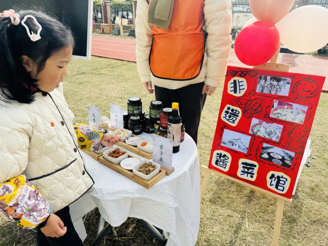 活动现场,“悦享乡音”“悦享艺创”“悦享书香”等10个主题摊位前人头攒动,小朋友与家长的欢声笑语此起彼伏。大家一边品尝闻万泰酱菜、眉毛饺等金山特色美食,一边聆听志愿者讲解各类美食的由来与制作工艺。