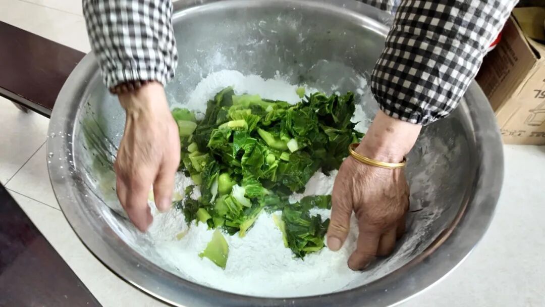 回到厨房,俞阿姨将芥菜洗净后切成小段,放入沸水中,加入少量盐和小苏打,用小火慢慢煮至酥烂。“加小苏打能保持芥菜的绿色,做出来更诱人,也能锁住它的鲜味。”俞阿姨介绍。煮好的芥菜捞出沥干,趁着温热倒入糯米粉中,反复揉搓,翠绿的菜泥与洁白的米粉渐渐融合,变成光滑柔软的面团,触感细腻,还带着淡淡的菜香。