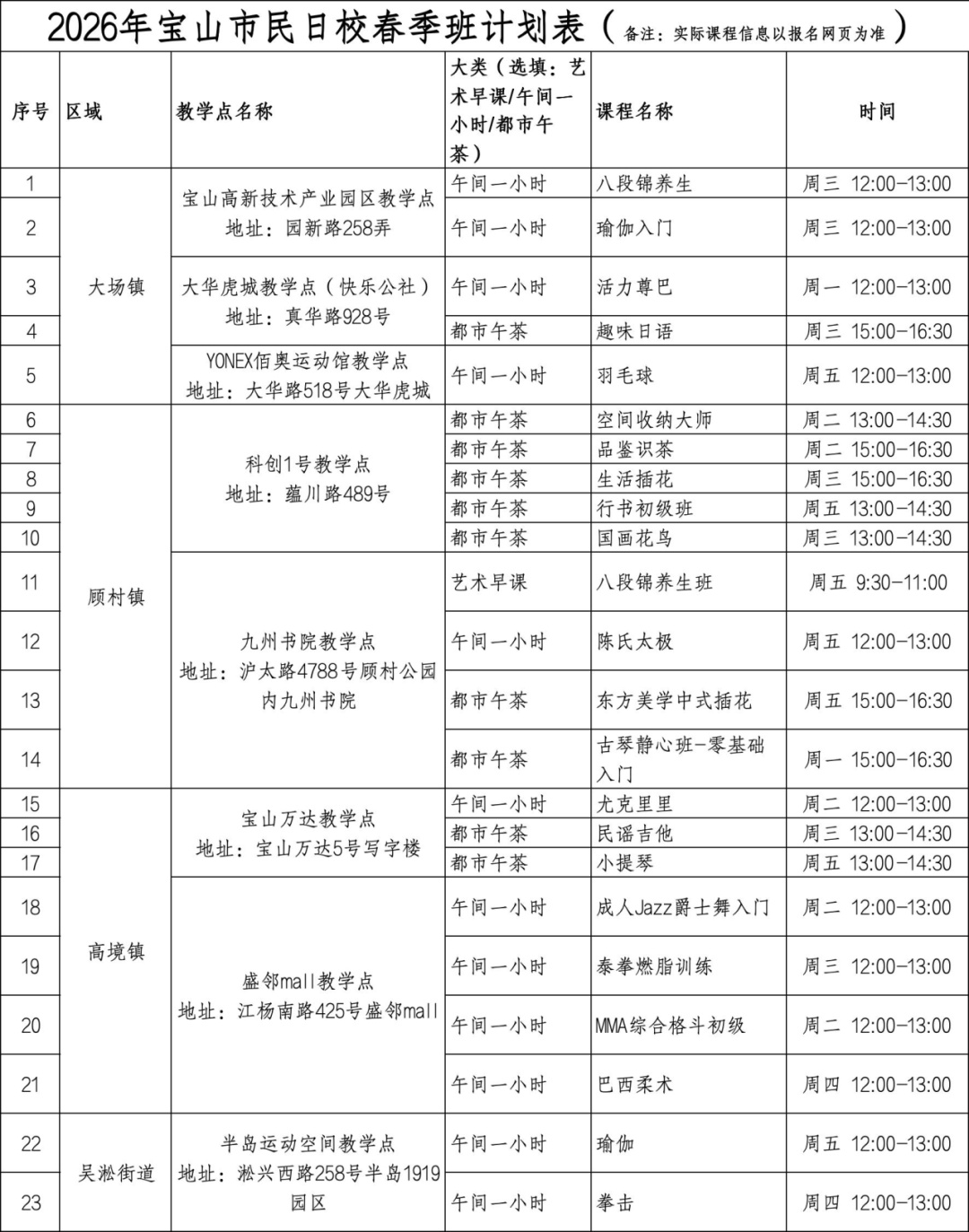 为深入贯彻落实党的二十大精神,践行“人民城市人民建,人民城市为人民”的重要理念,进一步拓展上海市公共文化服务的广度与深度,有效满足多元市民群体在工作日白天时段的艺术培训需求,特开展“上海市民日校”项目。该项目由上海市文化和旅游局主办,上海市群众艺术馆、各区文旅局和相关条线单位具体承办。 4月13日—7月17日 每周一至周五工作日间 【艺术早课】9:30—11:00 【午间一小时】12:00—13:00 【都市午茶】13:00—14:30、15:00—16:30 18—70周岁 3月8日上午10:00—3月20日下午5:00 直接扫描下方二维码,并按需选择课程。 学员报名成功后,如遇特殊情况有退费需求,请于退款截止时间2026年3月20日上午10:00前,通过市民日校报名平台提出退款申请,经审核后,可按照规定退还学费。退款截止后不接受退费,请在报名前确认上课时间、地点、课程安排等信息。 报名技术咨询电话:54231269 (9:30—11:00、13:30—16:00,节假日除外) 服务咨询:54248393 各分校咨询电话请查看下表: 春风送暖,万物向新。 不必远行,不必耗时,家门口的精彩课堂已为你准备好。 2026宝山市民日校春季班温暖上线,全区共开设8个教学点位、23门精品课程,将运动活力、生活美学、专业教学与诗意风景融为一体,让学习点亮日常。 外教专业亲授 技艺精益求精 盛邻MALL教学点三大硬核课程——泰拳燃脂训练、MMA综合格斗初级、巴西柔术,全部由资深外籍教练亲自授课,专业度拉满! 泰拳教练:泰国资深金腰带教练,从12岁就参加泰拳训练营,技法正宗、教学扎实。 MMA&柔术教练:巴西现役运动员,柔术黑带二段,兼具8年实战与教学经验。 不用远行,两位教练把前沿、科学的国际化训练理念带到课堂,在家门口就能解锁正统训练! 书院赏樱习艺 自然与美同行 樱花盛开的季节,最适合与美好相遇。 顾村公园内的九州书院教学点开设特色课程,樱花为伴、古韵悠然。 无论是八段锦养生、陈氏太极,还是中式插花、古琴静心,都能在此调养身心,于一呼一吸、一花一弦间,感受东方雅致与诗意。 贴心福利:报名九州书院课程,即可免顾村公园门票! 在风景里上课,在自然中成长。 午间焕新活力 健康不负时光 拒绝午间虚度! 12门午间一小时运动课程同步推出 涵盖尊巴、格斗、八段锦、瑜伽等 动静结合,快速充电,让你以饱满状态迎接下午工作 课程多元精彩 总有一款适配 更有爵士舞、尤克里里、羽毛球等多元课程,满足技能提升、兴趣培养、心灵放松等多重需求。 名额有限,先到先得 更多2026宝山市民日校春季班精彩课程,详见下方课程表: 愿你以春为序,以学为伴 共赴宝山市民日校之约 遇见更丰盈的自己!