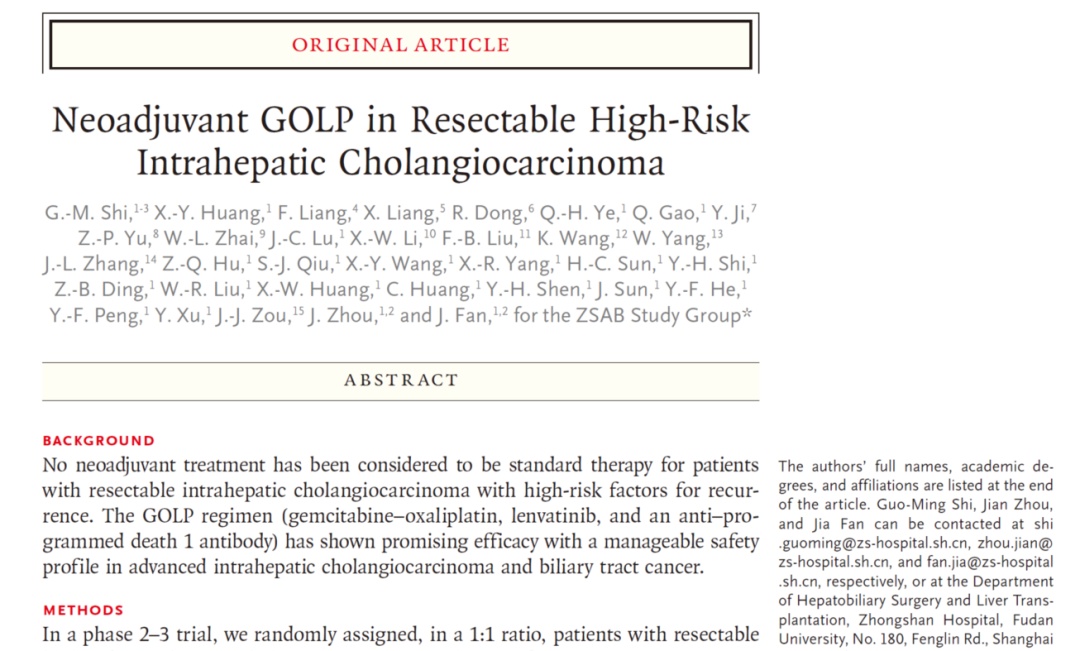 日前,复旦大学附属中山医院肝胆肿瘤与肝移植外科樊嘉院士、周俭院士、施国明教授团队在国际医学顶刊《新英格兰医学》报道了一篇题为《新辅助GOLP方案在可切除、伴高危复发肝内胆管癌研究[Neoadjuvant GOLP in Resectable High-Risk Intrahepatic Cholangiocarcinoma]》的临床研究突破性成果。该研究探讨“GOLP新辅助创新方案”在高危复发肝内胆管癌治疗中的价值,为高危复发的肝内胆管癌病人带来长期生存的希望。