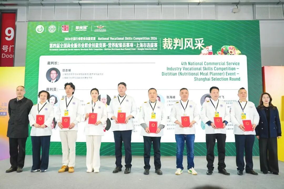 经过激烈角逐,本次选拔赛共产生66个奖项。其中,学生组共29人获奖:特金奖2项、金奖5项、银奖8项、铜奖14项;职业组共37人获奖:特金奖7项、金奖20项、银奖10项。按照国赛晋级名额要求,本次选拔赛排名前五的选手将代表上海赛区,参加2026年全国商业服务业职业技能竞赛“营养配餐员”赛项总决赛,与全国高手同台竞技。
