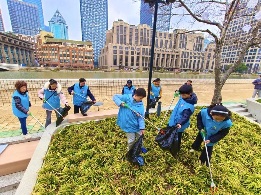 3月6日下午,“爱我家园”苏州河护河队志愿者和报童小学、北京东路小学的孩子们,沿着亲水步道开展日常护河行动。刘歆摄
